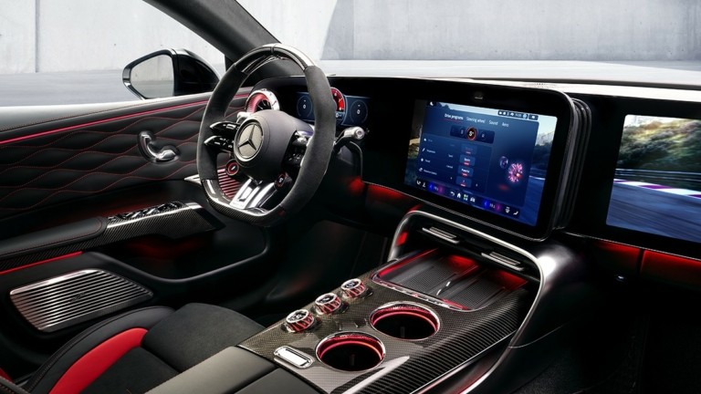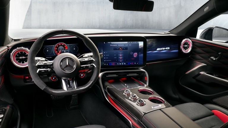 Το cockpit έχει σχεδιαστεί πλήρως με γνώμονα τον οδηγό. Ένας ψηφιακός πίνακας οργάνων 10,2 ιντσών συνδυάζεται με μια οθόνη πολυμέσων 14 ιντσών, δημιουργώντας ένα ενιαίο ψηφιακό περιβάλλον υψηλής ευκρίνειας. Προαιρετικά, διατίθεται και ξεχωριστή οθόνη 14 ιντσών για τον συνοδηγό. Το infotainment βασίζεται στη νέα πλατφόρμα MB.OS και στο σύστημα Mercedes‑Benz User Experience, προσφέροντας εξελιγμένες λειτουργίες, διαφορετικά γραφικά περιβάλλοντα και ειδικές ενδείξεις για οδήγηση υψηλών επιδόσεων, όπως το AMG TRACK PACE με δεδομένα τηλεμετρίας.
