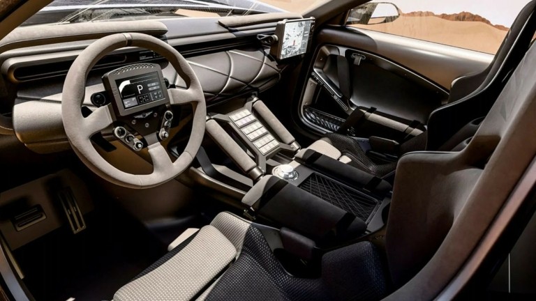 Το εσωτερικό είναι εξίσου αγωνιστικό: τιμόνι motorsport με ψηφιακό πίνακα οργάνων, μπάκετ καθίσματα, πόρτες από ανθρακονήματα, δερμάτινο ταμπλό με καπιτονέ επένδυση και πληθώρα χειρολαβών επενδυμένων με Alcantara. Στην πλευρά του συνοδηγού υπάρχει οθόνη infotainment, ενώ στην κεντρική κονσόλα συναντά κανείς 24 φυσικά κουμπιά για τον έλεγχο των συστημάτων του οχήματος.