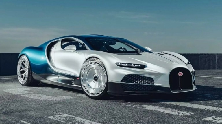 Στις ψηφιακές απεικονίσεις του σχεδιαστή Karan Adivi, η Bugatti Tourbillon εμφανίζεται με ασημί και μπλε χρωματισμό, που αναδεικνύει ιδανικά τις ακραία αεροδυναμικές γραμμές της.
