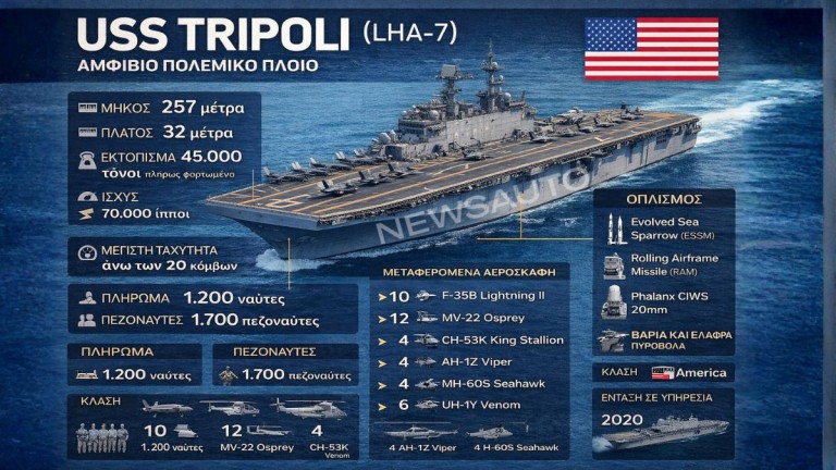 Με απλά λόγια, το USS Tripoli δεν είναι απλώς ένα ακόμη πολεμικό πλοίο. Πρόκειται για μια πλωτή στρατιωτική βάση, ικανή να μεταφέρει στρατό, αεροσκάφη, ελικόπτερα και βαριά οπλικά συστήματα, να διοικεί επιχειρήσεις και να παρεμβαίνει σε κρίσεις οπουδήποτε στον κόσμο. Και αυτός ακριβώς είναι ο λόγος που η αποστολή του στη Μέση Ανατολή θεωρείται μια κίνηση υψηλού στρατηγικού συμβολισμού.