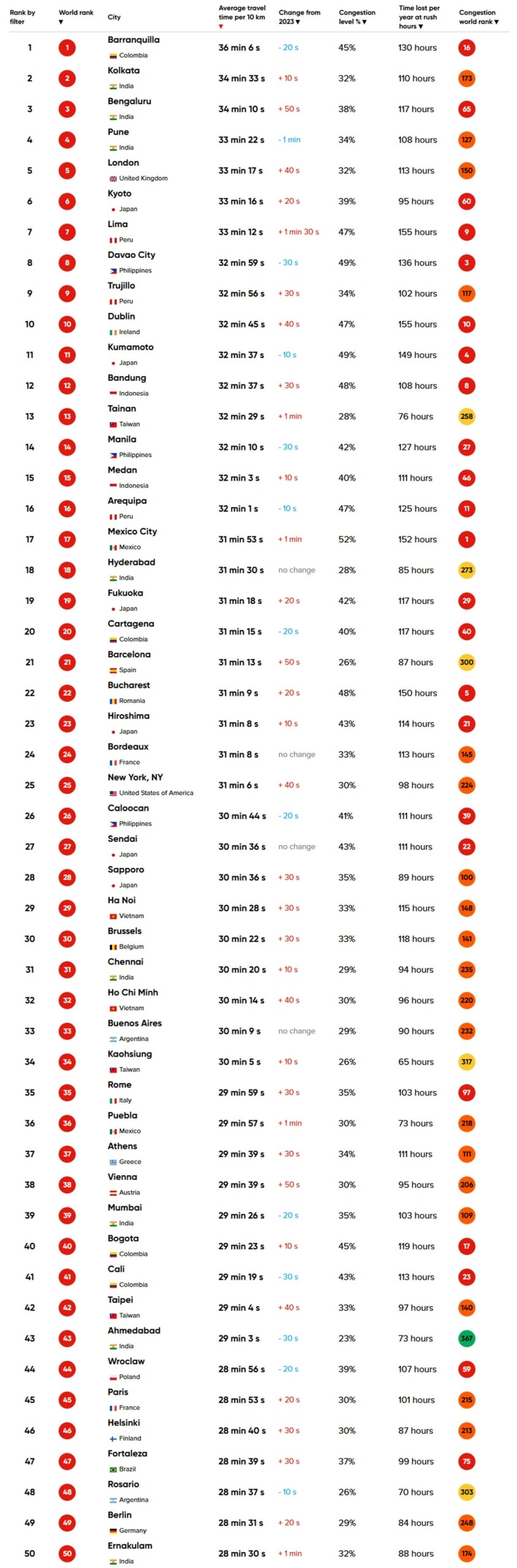 Η εταιρεία TomTom, γνωστή για τα συστήματα πλοήγησης, δημοσίευσε την ετήσια έκθεσή της για την κυκλοφορία σε δεκάδες πόλεις του κόσμου. Η λίστα περιλαμβάνει παραδοσιακά «πρωταθλήτριες» στο μποτιλιάρισμα, όπως το Δουβλίνο, η Βαρκελώνη και η Μόσχα, αλλά και λιγότερο αναμενόμενες πόλεις όπως η Τροχίγιο στο Περού ή το Νταβάο στις Φιλιππίνες.